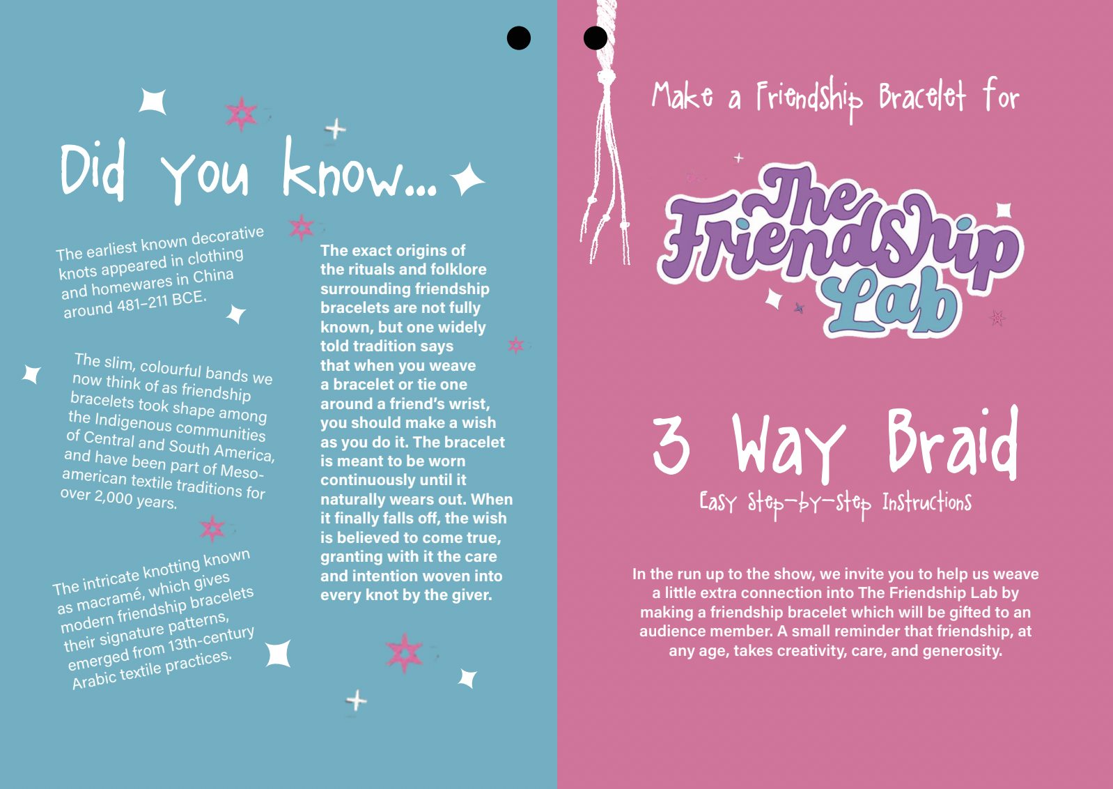 In the lead up to the show we’re inviting people to help weave a little extra connection into the show by making friendship bracelets which will be gifted to an audience member. A small reminder that friendship at any age takes creativity, care and generosity.
